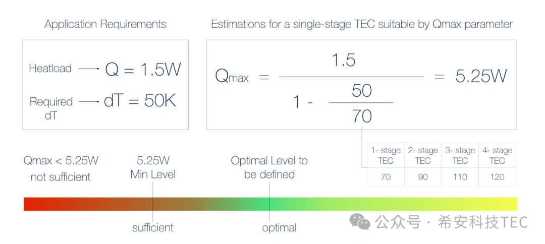 ຄວາມຕ້ອງການຫຼັກສໍາລັບການຄັດເລືອກ TEC: ໂຫຼດ qc, ອຸນຫະພູມປະຕິບັດການ TC, ອຸນຫະພູມສຸດທ້າຍຮ້ອນນີ້, dt = th-tc. ຍົກຕົວຢ່າງ: qc = 1.5W, DT = 50k, qmax = 1.5 (1-50 / 70) = 5.25W. ນີ້ແມ່ນ QMAX 5.25W ວິທີແກ້ໄຂທີ່ດີທີ່ສຸດບໍ? ບໍ່, 5.25 ແມ່ນ QMAX ນ້ອຍທີ່ສຸດໃນໃບສະຫມັກນີ້. QMAX ແມ່ນບໍ່ຈໍາເປັນຕ້ອງມີຂະຫນາດໃຫຍ່ທີ່ດີກວ່າ. ຖ້າມັນໃຫຍ່ກວ່າ, ຈໍານວນຄູ່ PN ຈະໃຫຍ່ກວ່າ, ແລະພະລັງງານທີ່ບໍລິໂພກຕົວມັນເອງກໍ່ຈະມີຫຼາຍຂື້ນ. ວິທີການຄິດໄລ່ນີ້ qmail ທີ່ດີທີ່ສຸດແມ່ນສັບສົນຫຼາຍແລະຕ້ອງການວິສະວະກອນການອອກແບບຄວາມຮ້ອນຄວາມຮ້ອນທີ່ເປັນມືອາຊີບ.